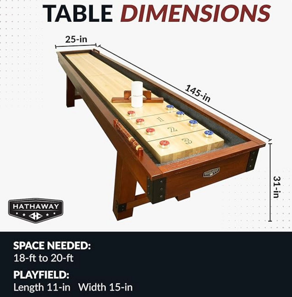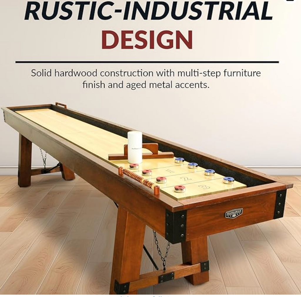 The Cheyenne Shuffleboard has the perfect mix of rustic-industrial design and quality craftsmanship. Crafted from furniture-grade solid hardwood and hardwood veneer, featuring robust, angled post legs that deliver a rock-solid foundation for the 1.75" thick butcher block playing surface. The rugged 1" thick cabinet and post legs are beautifully finished in a multi-step furniture finish accented with aged metal hardware. More than just a stylish addition to your gaming space, it’s a beautiful piece of furniture that is functional and fun. Comes with all shuffleboard accessories: 4 Blue pucks, 4 Red pucks, 2 ABS abacus scoring units, 1 table brush and 1 can of table wax. 180-day limited warranty.